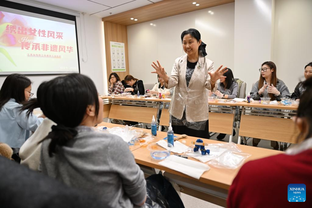 A teacher instructs students to make tie-dye creations at a night school in the Xiong'an New Area, north China's Hebei Province, March 14, 2025. Since China announced plans to establish the Xiong'an New Area in April 2017, it has evolved from a blueprint into a vibrant city.