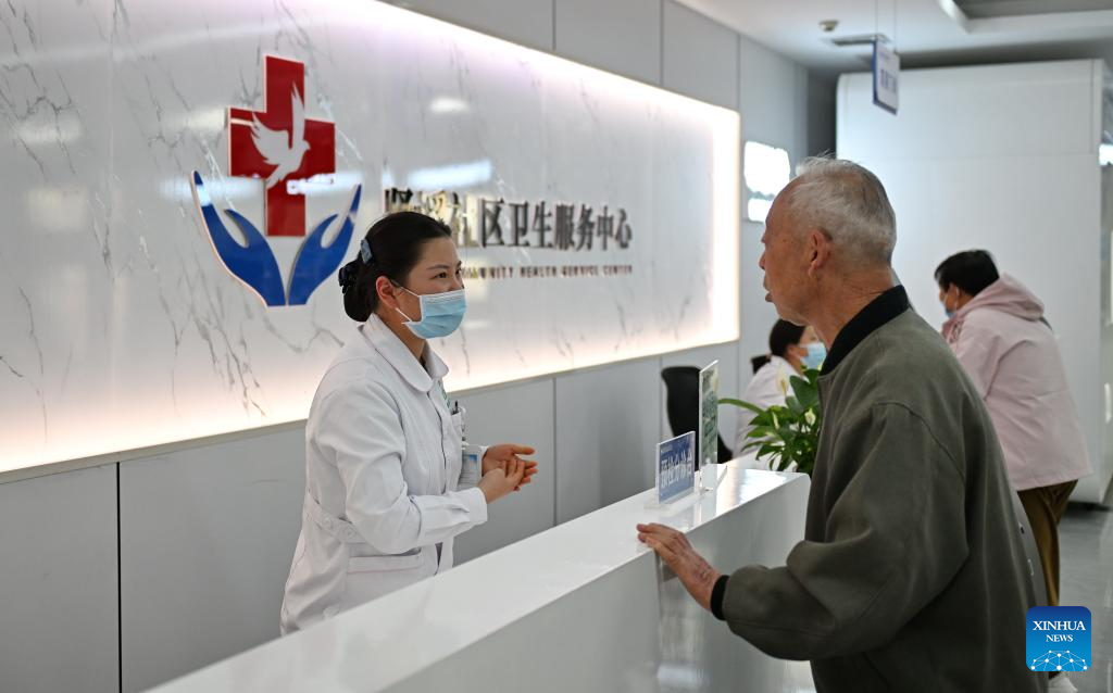 A staff member helps a resident at a community health service center in the Rongxi area, the Xiong'an New Area, north China's Hebei Province, March 25, 2025. Since China announced plans to establish the Xiong'an New Area in April 2017, it has evolved from a blueprint into a vibrant city.