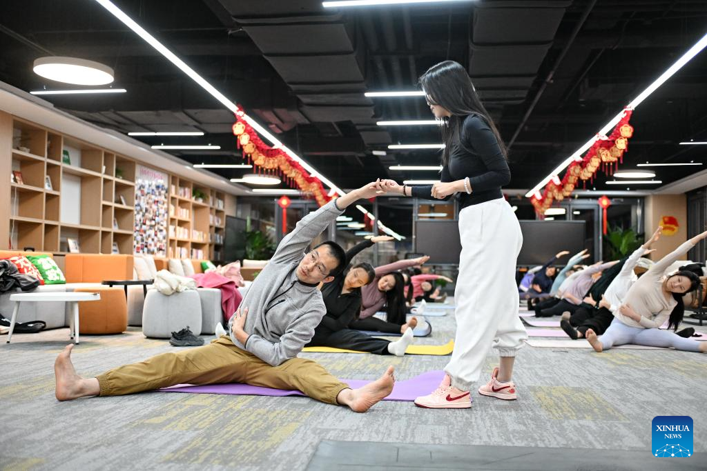 People practice yoga under the guidance of a teacher at a night school in the Xiong'an New Area, north China's Hebei Province, March 18, 2025. Since China announced plans to establish the Xiong'an New Area in April 2017, it has evolved from a blueprint into a vibrant city.