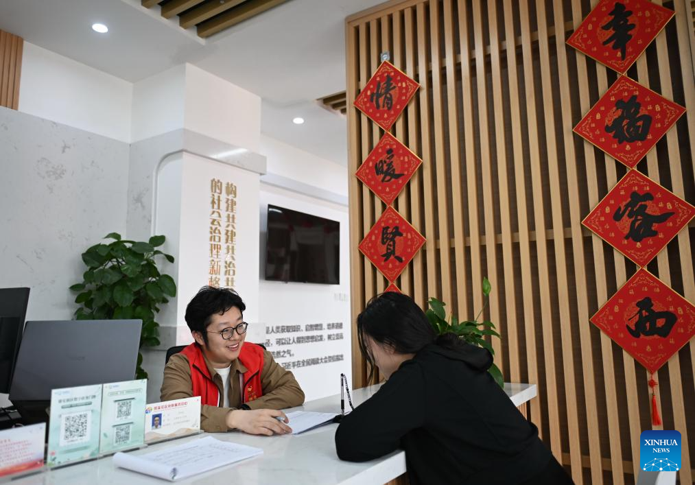 A staff member helps a resident handle business at the community comprehensive service station in the Rongxi area, the Xiong'an New Area, north China's Hebei Province, March 25, 2025. Since China announced plans to establish the Xiong'an New Area in April 2017, it has evolved from a blueprint into a vibrant city.