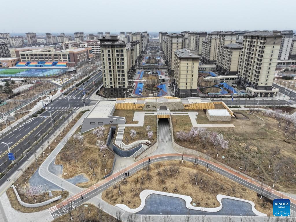 An aerial drone photo taken on March 16, 2025 shows a pseudo-classic architecture in Yuerong Park in Xiong'an New Area, north China's Hebei Province.