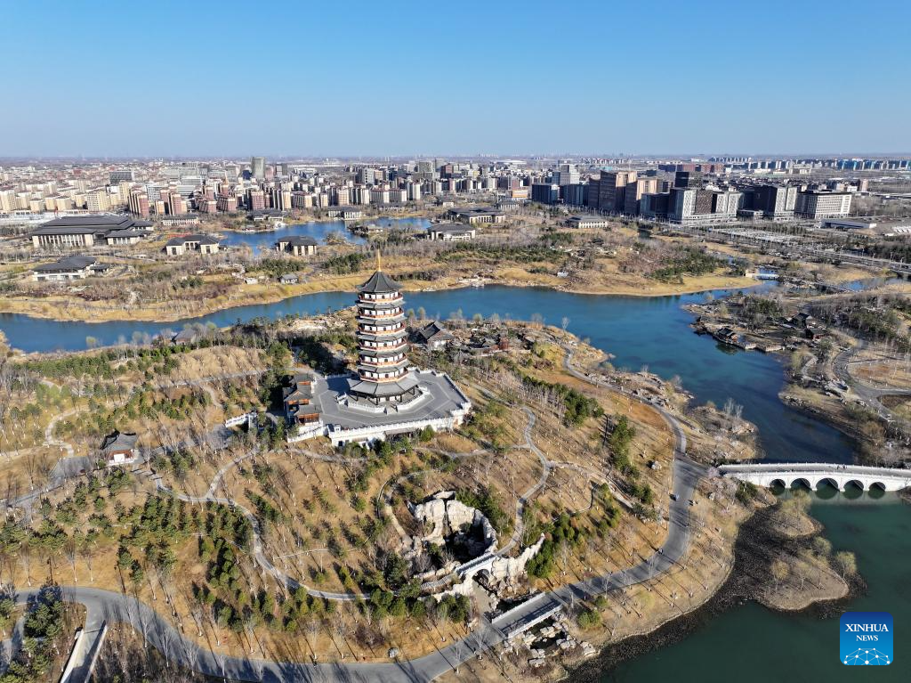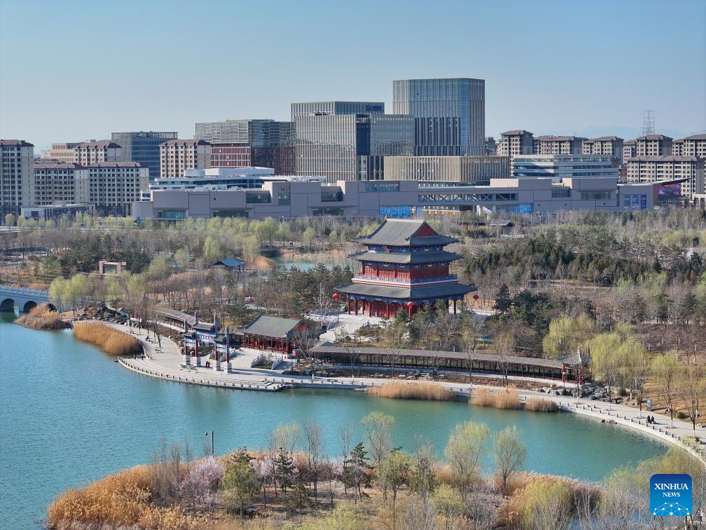 A drone photo taken on March 16, 2025 shows a pseudo-classic architecture in Jinhu Park in Xiong'an New Area, north China's Hebei Province.