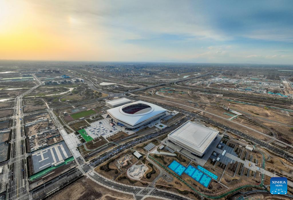 An aerial drone photo taken on March 27, 2025 shows the Xiong'an sports center in Xiong'an New Area, north China's Hebei Province.