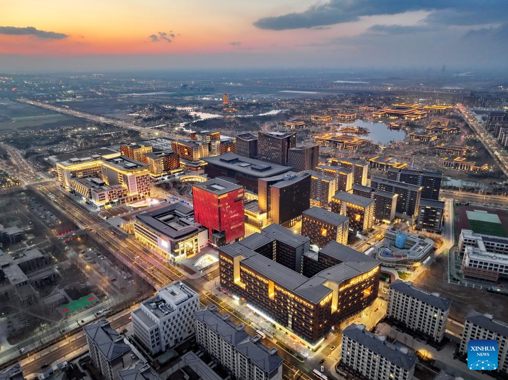 An aerial drone photo taken on March 15, 2025 shows a night view of the Xiong'an business service center in Xiong'an New Area, north China's Hebei Province.