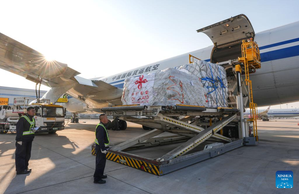 Staff members load China's first batch of emergency humanitarian aid to Myanmar onto an airplane at Beijing Capital International Airport in Beijing, capital of China, March 31, 2025. (Xinhua/Chen Yehua)