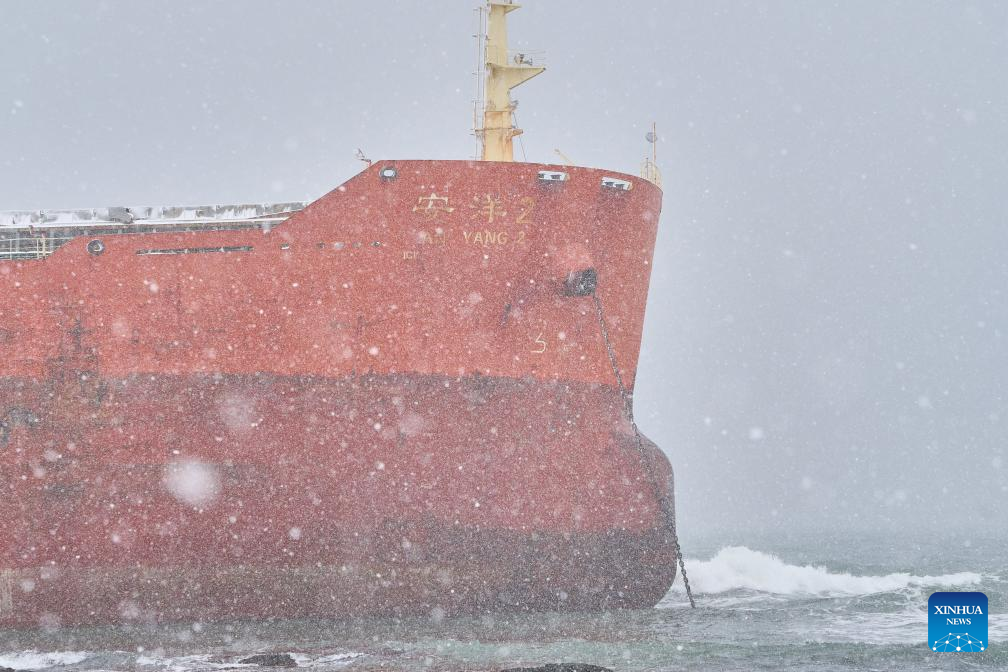 This photo taken on March 30, 2025 shows the grounded Chinese cargo ship Anyang-2 near Nevelsk, Russia. (Photo by Guo Feizhou/Xinhua)
