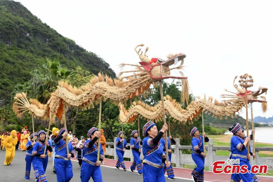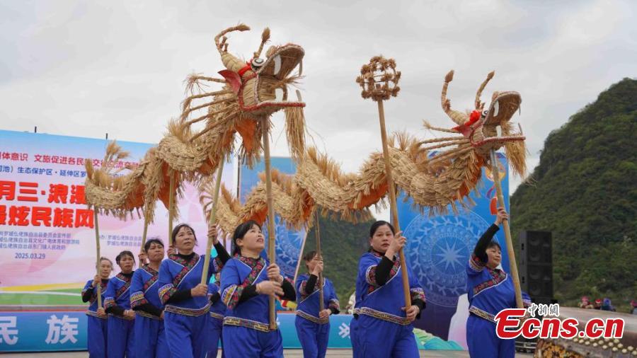Villagers perform dragon dance to greet the Sanyunsan Festival in Luocheng Mulam Autonomous County, south China's Guangxi Zhuang Autonomous Region, March 29, 2025. (China News Service/Liao Guangfu)