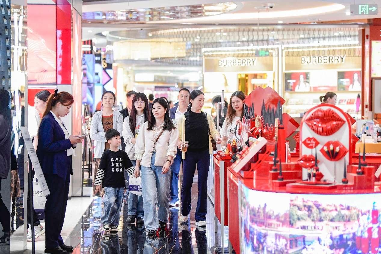 Consumers browse duty-free products at Haikou Riyue Plaza Duty Free Shop in Haikou, south China's Hainan province. (People's Daily Online/Su Bikun)