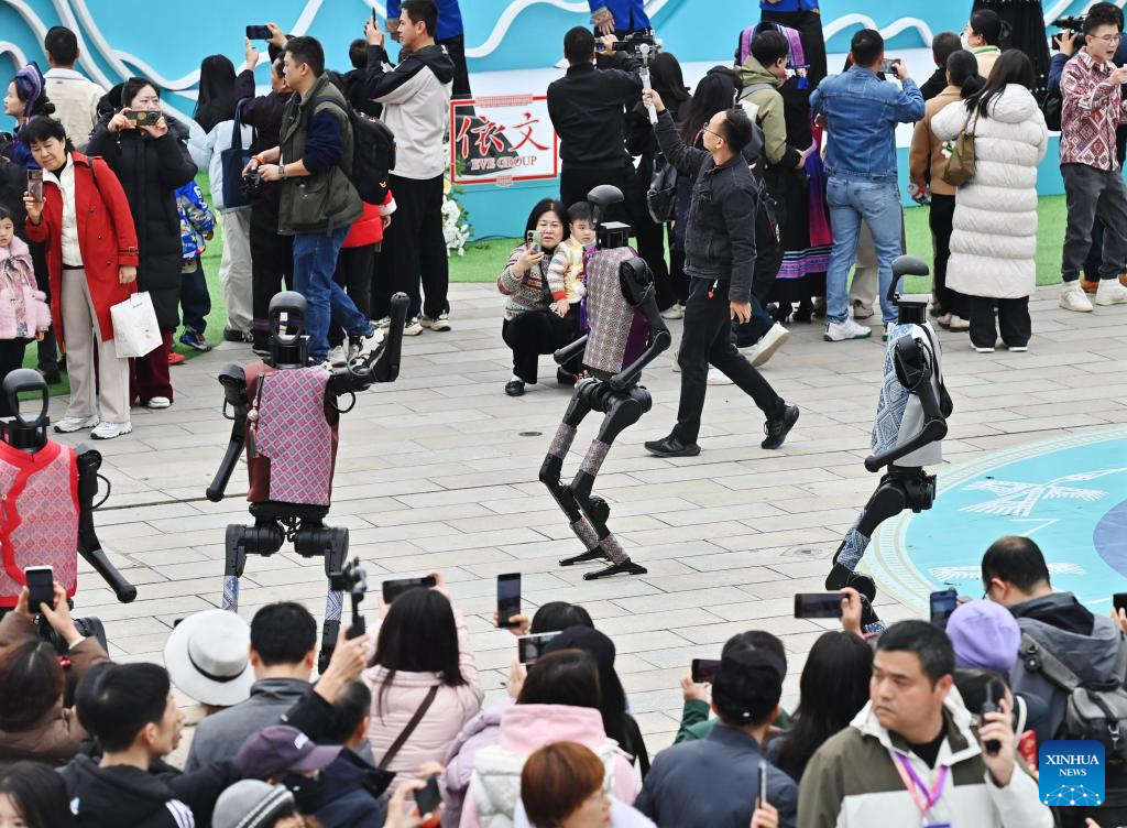 Robots dance during the opening ceremony of a carnival in Nanning, south China's Guangxi Zhuang Autonomous Region, March 31, 2025. The carnival opened in Nanning on Monday to celebrate the Sanyuesan Festival, a festival celebrated on the third day of the third lunar month, which falls on March 31 this year. (Xinhua/Zhou Hua)