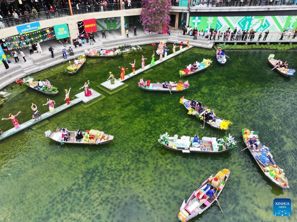 An aerial drone photo taken on March 31, 2025 shows a floating bazaar at the opening ceremony of a carnival in Nanning, south China's Guangxi Zhuang Autonomous Region. The carnival opened in Nanning on Monday to celebrate the Sanyuesan Festival, a festival celebrated on the third day of the third lunar month, which falls on March 31 this year. (Xinhua/Zhou Hua)
