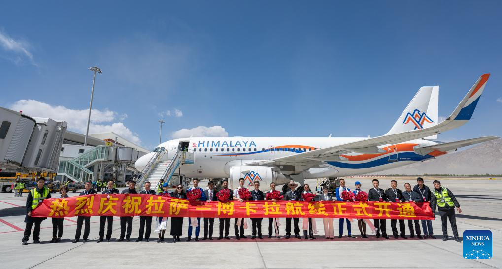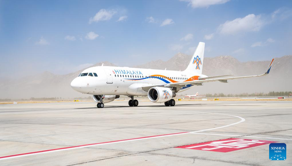 A maiden flight from Lhasa to Pokhara is seen at Lhasa Gonggar International Airport in Lhasa, southwest China's Xizang Autonomous Region, March 31, 2025. A new direct air route linking Lhasa, capital city of Xizang Autonomous Region in China, and Pokhara, the second-largest city in Nepal, has been launched. (Xinhua/Tenzin Nyida)