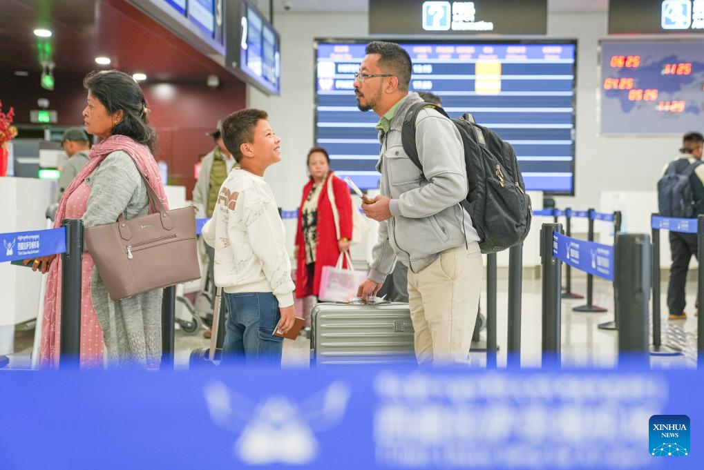 Passengers to take the flight from Lhasa to Pokhara quene at check-in counter at Lhasa Gonggar International Airport in Lhasa, southwest China's Xizang Autonomous Region, March 31, 2025. A new direct air route linking Lhasa, capital city of Xizang Autonomous Region in China, and Pokhara, the second-largest city in Nepal, has been launched. (Xinhua/Tenzin Nyida)