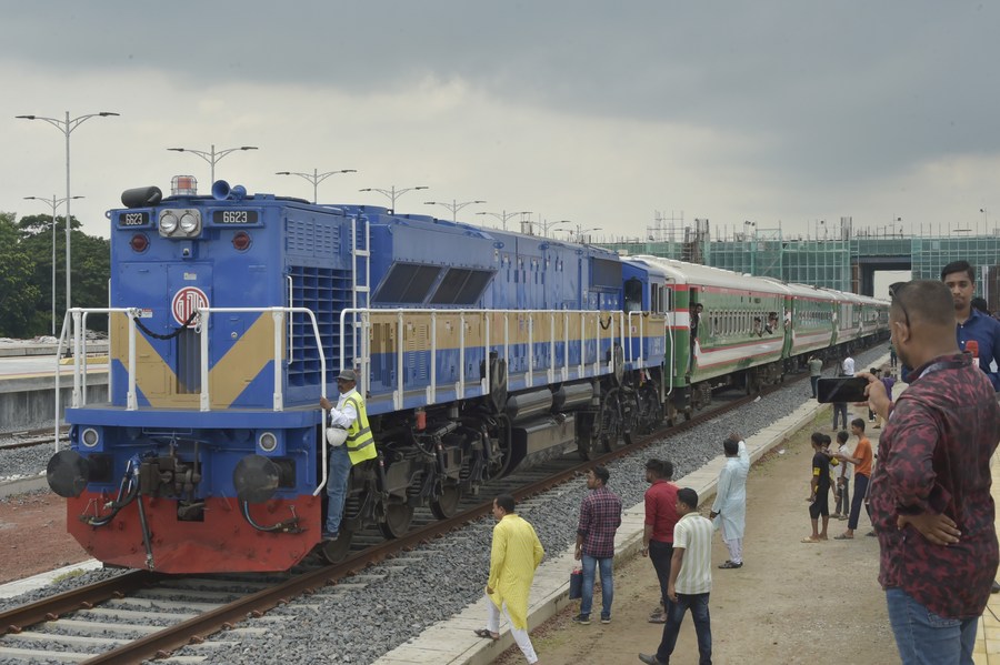 A man takes photos of a train ready for a trial run along the newly-constructed mega Belt and Road Initiative (BRI) rail line via the China-built Bangladesh's largest Padma Bridge on the outskirts of Dhaka, Bangladesh, Sept 7, 2023. (Photo/Xinhua)