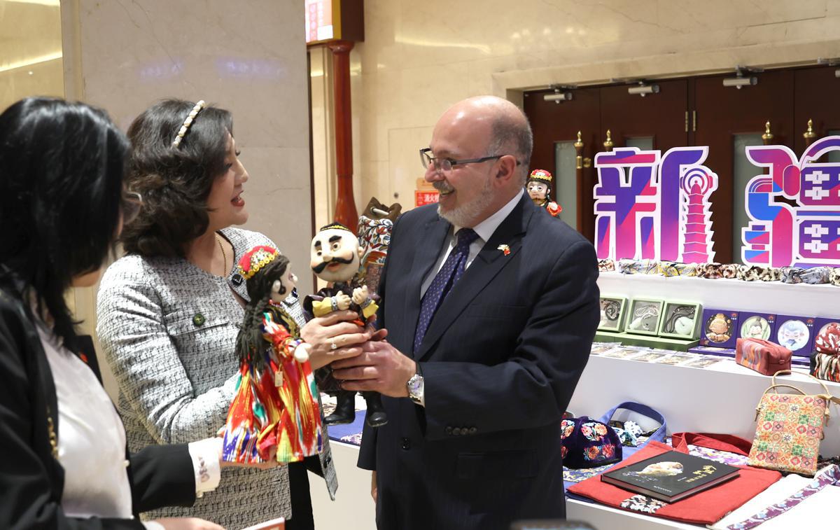 Alberto Blanco Silva (right), the Cuban ambassador to China, and his wife, Moraima Rodriguez Nuviola (left), attend an exhibition on specialty products of the Xinjiang Uygur autonomous region during a reception in Beijing on Monday. (Zou Hong/China Daily)