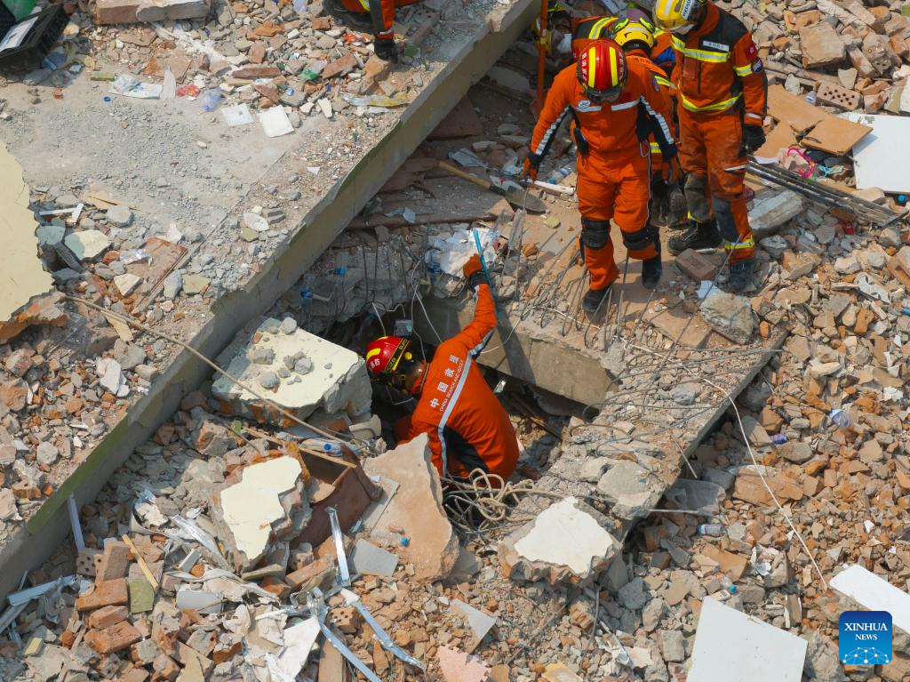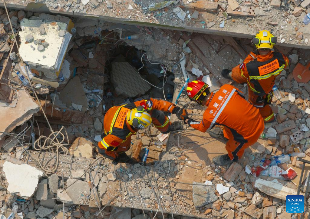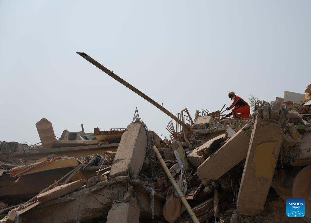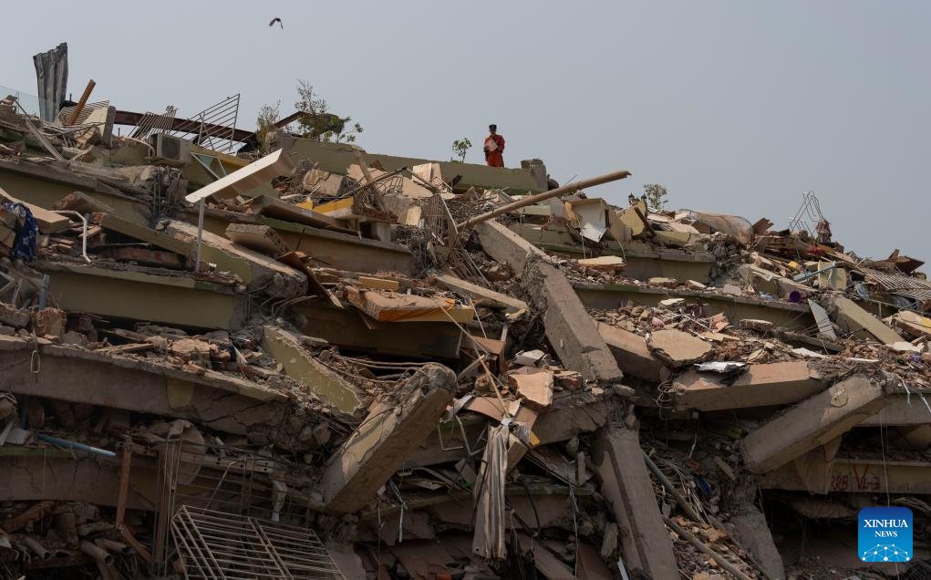 China Search and Rescue Team, assigned by the country's Ministry of Emergency Management, and a rescue team from China's Hong Kong carry out a joint search and rescue operation at the Sky Villa residence in Mandalay, Myanmar, April 1, 2025.
