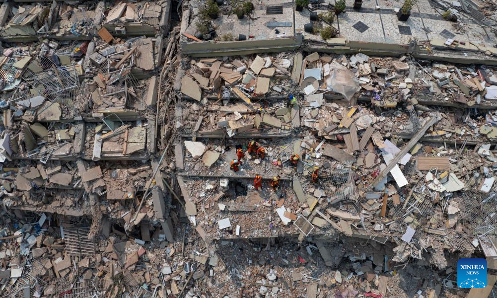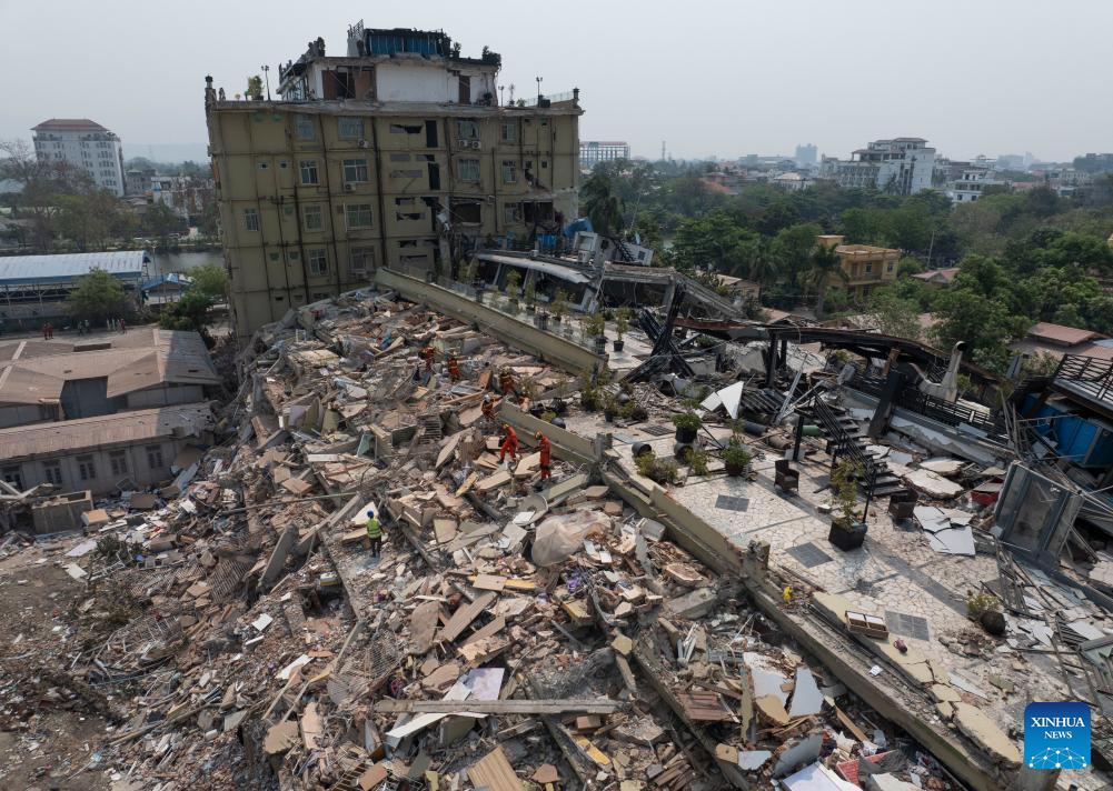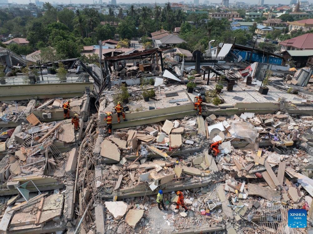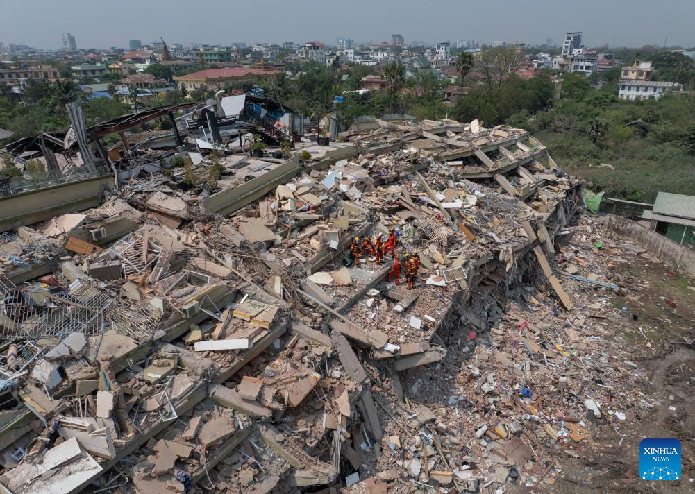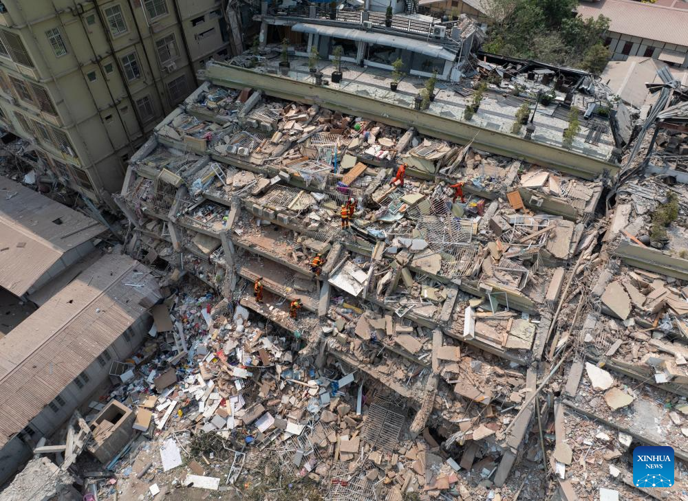 In this aerial drone photo, China Search and Rescue Team, assigned by the country's Ministry of Emergency Management, and a rescue team from China's Hong Kong carry out a joint search and rescue operation at the Sky Villa residence in Mandalay, Myanmar, April 1, 2025.