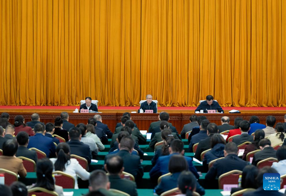 Li Hongzhong, a member of the Political Bureau of the Communist Party of China Central Committee and vice chairman of the National People's Congress (NPC) Standing Committee, speaks at a launching ceremony for this year's first term of study sessions for NPC deputies in Beijing, capital of China, April 1, 2025. (Xinhua/Zhai Jianlan)