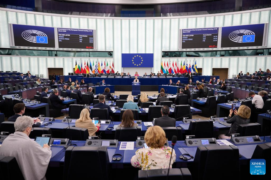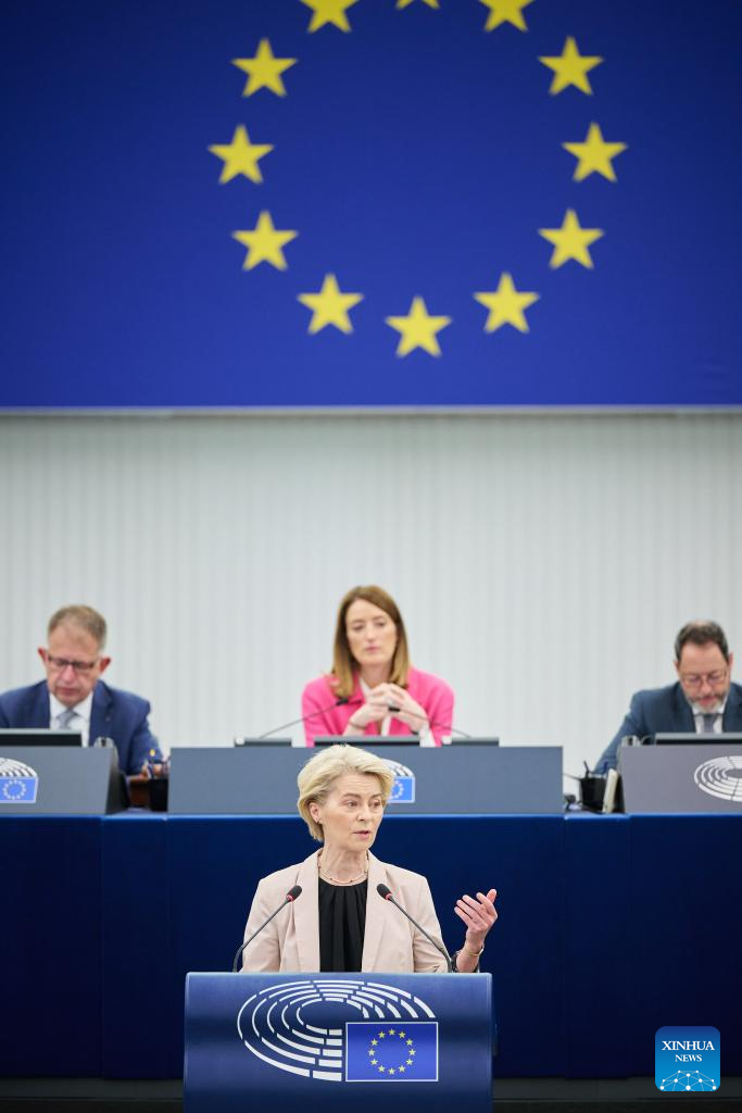 European Commission President Ursula von der Leyen addresses the European Parliament in Strasbourg, France, April 1, 2025. The European Union (EU) has a strong plan in place to retaliate against U.S. tariffs and will not hesitate to act if necessary, von der Leyen said on Tuesday. (European Union/Handout via Xinhua)