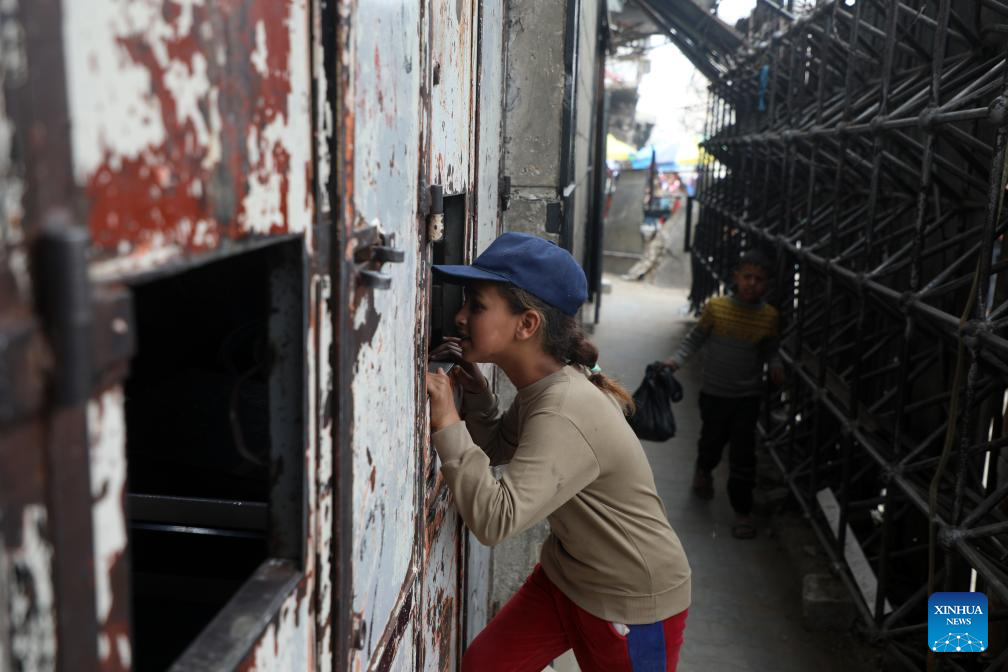 A girl looks at a closed bakery in Gaza City, on April 1, 2025. The aid blockade has forced the shuttering of 25 bakeries in Gaza as food supplies shrivel, Israel's evacuation orders increase and bombardments continue, UN humanitarians said on Tuesday. (Photo by Rizek Abdeljawad/Xinhua)