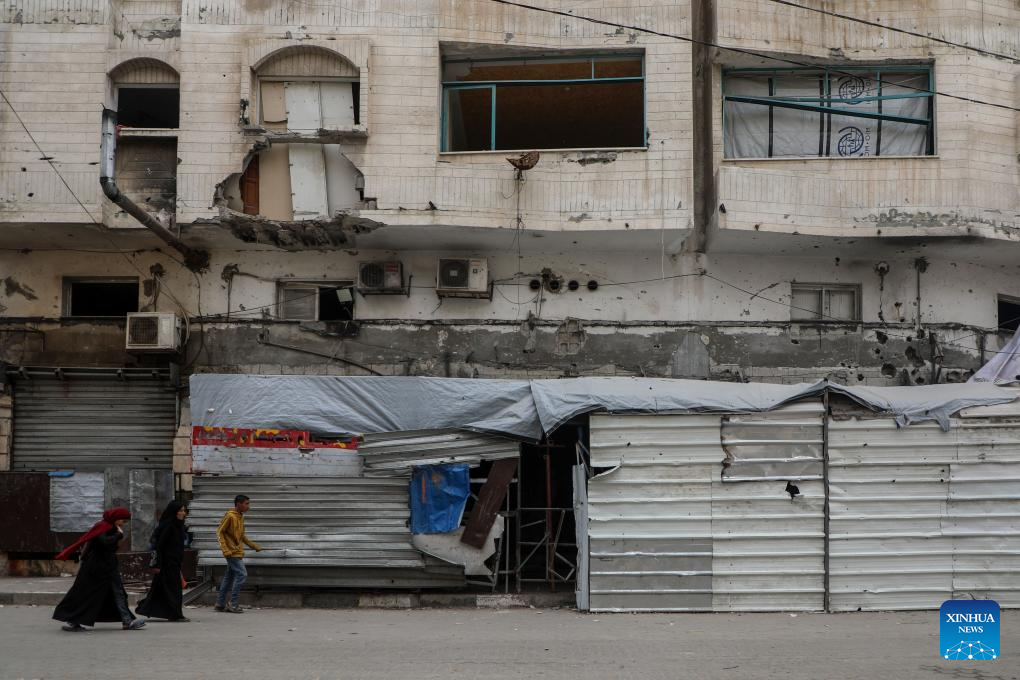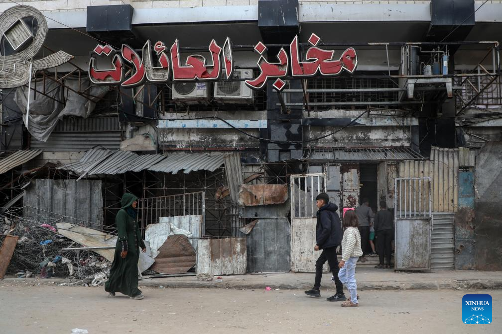 People walk past a closed bakery in Gaza City, on April 1, 2025. The aid blockade has forced the shuttering of 25 bakeries in Gaza as food supplies shrivel, Israel's evacuation orders increase and bombardments continue, UN humanitarians said on Tuesday. (Photo by Rizek Abdeljawad/Xinhua)