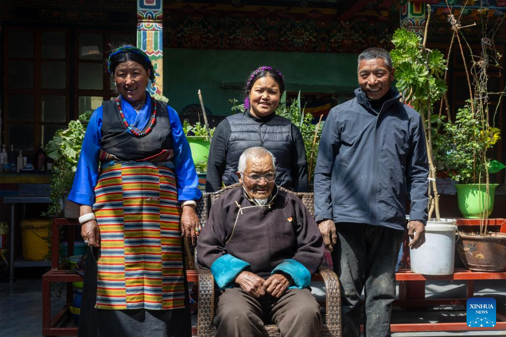 Phurjung (front) poses with his son Ngodrup (1st R, back), his daughter-in-law Qoizong (1st L, back) and his granddaughter Qime Lhamo at home in Samdrutse district of Xigaze City, southwest China's Xizang Autonomous Region, March 17, 2025. (Xinhua/Jiang Fan)