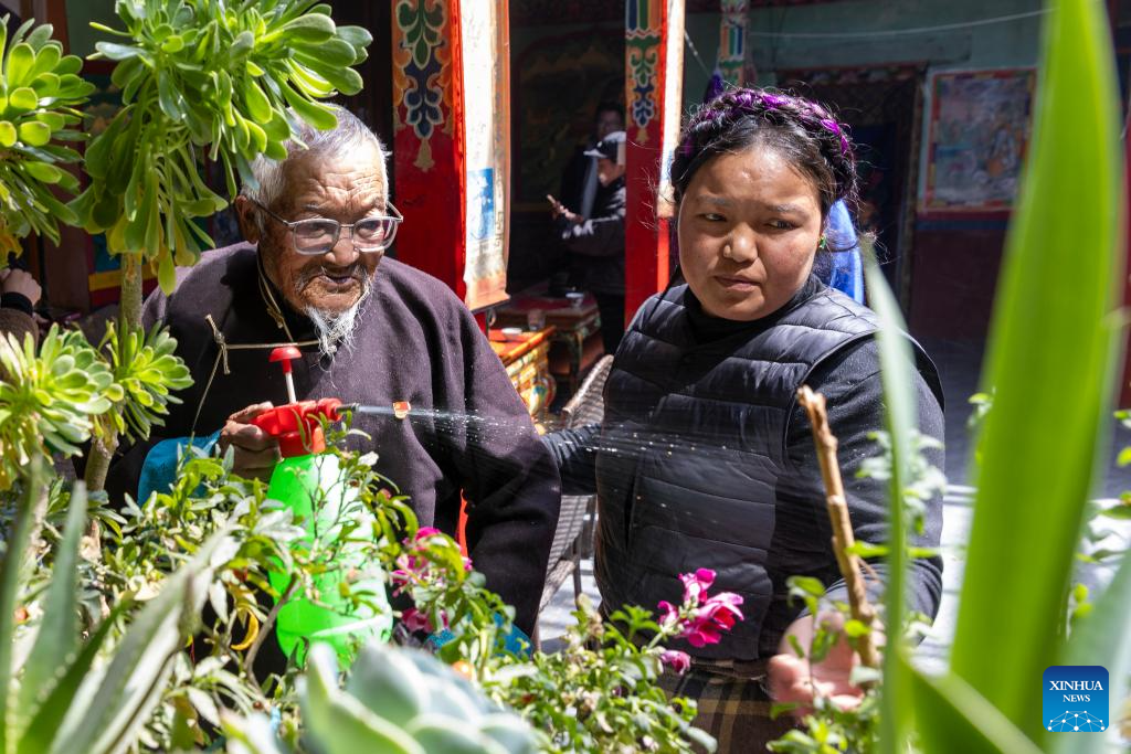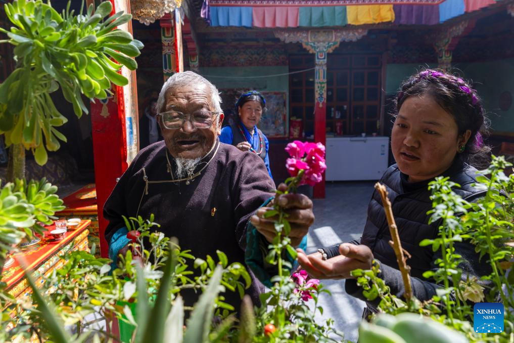 Phurjung (L) and his granddaughter take care of flowers at home in Samdrutse district of Xigaze City, southwest China's Xizang Autonomous Region, March 17, 2025. (Xinhua/Jiang Fan)