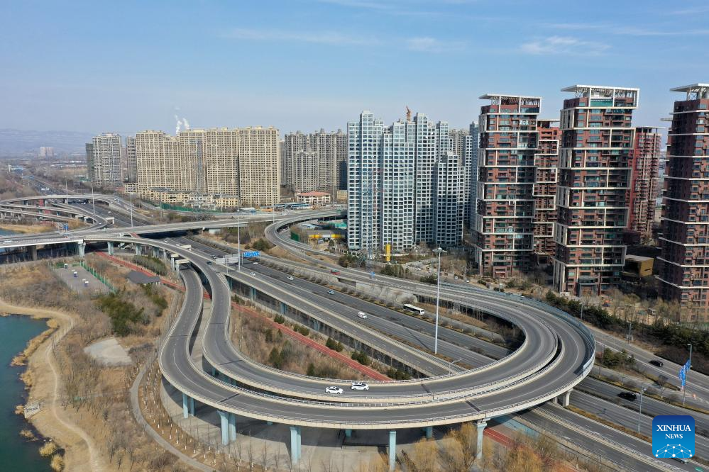 An aerial drone photo taken on Feb. 19, 2025 shows cars running on an interchange in Jinyuan District of Taiyuan City, north China's Shanxi Province.