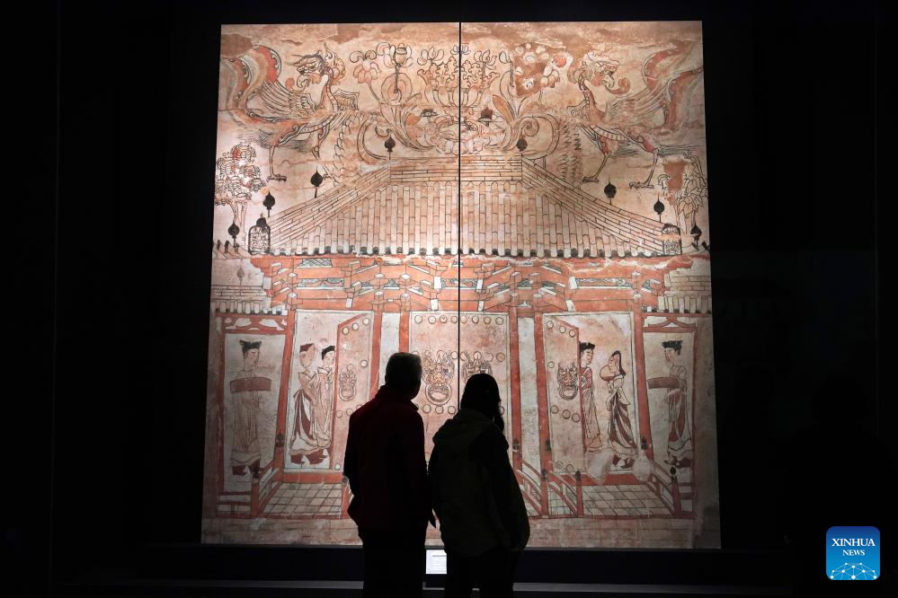 Visitors view a mural painting at the Taiyuan Northern Qi Dynasty Mural Museum in Taiyuan, north China's Shanxi Province, March 21, 2024.