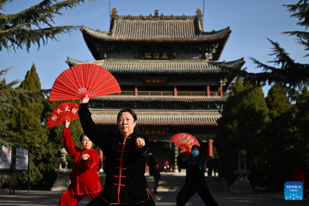 Citizens practice Tai Chi fan at Yingze Park in Yingze District of Taiyuan, north China's Shanxi Province, March 1, 2023.