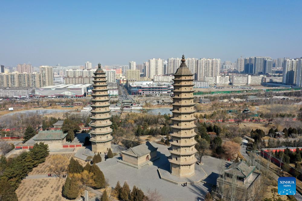 An aerial drone photo taken on Feb. 18, 2025 shows the Yongzuo Temple in Taiyuan City, north China's Shanxi Province.