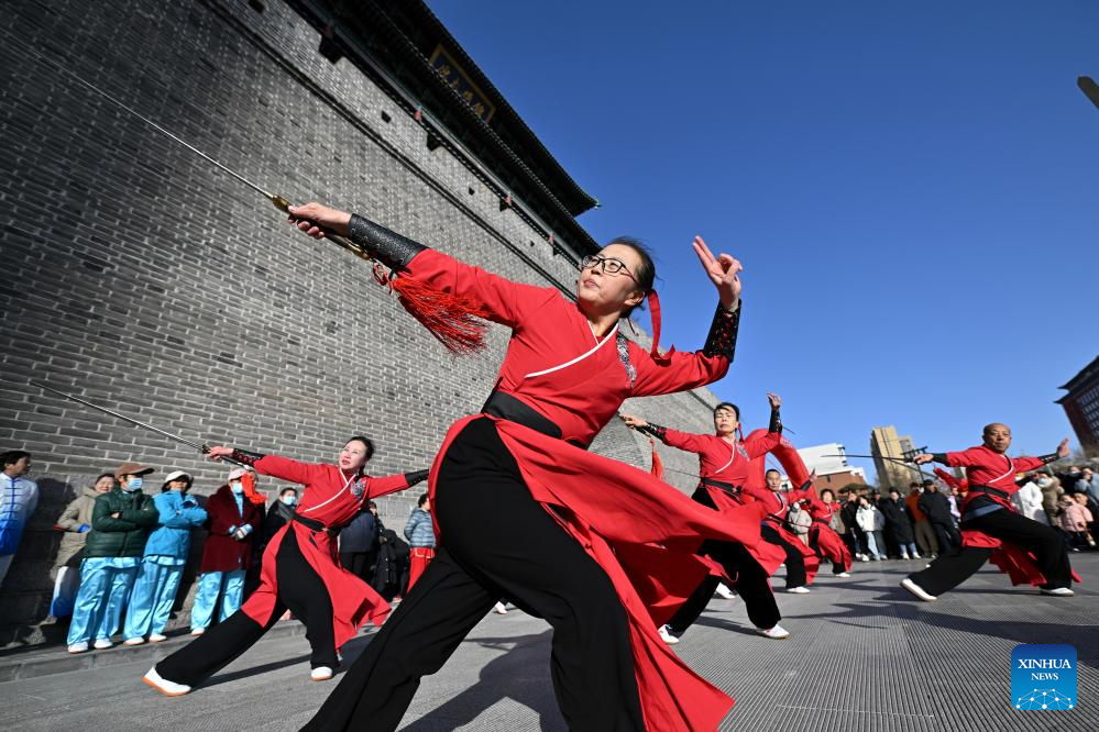 Martial art enthusiasts perform at a square in Taiyuan City, north China's Shanxi Province, Feb. 12, 2025.