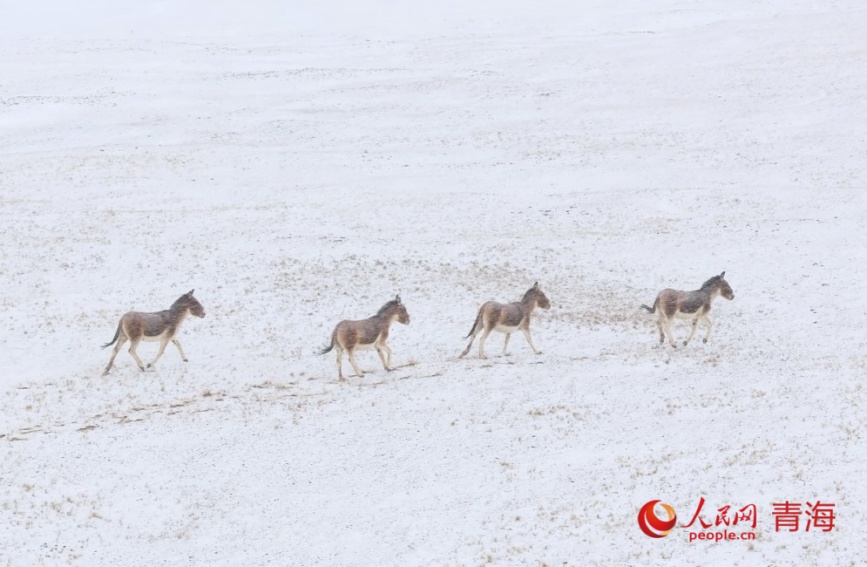 Tibetan wild donkeys are seen in the snow at Hoh Xil National Nature Reserve in northwest China's Qinghai Province. (People's Daily Online/He Yong)