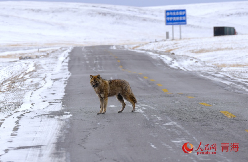 A wolf is seen on a stretch of the No. 109 national highway at Hoh Xil National Nature Reserve in northwest China's Qinghai Province. (People's Daily Online/Gan Haiqiong)