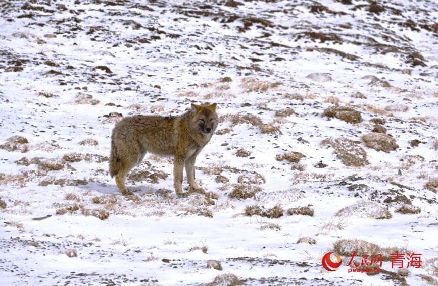 A wolf is spotted near the No. 109 national highway at Hoh Xil National Nature Reserve in northwest China's Qinghai Province. (People's Daily Online/Gan Haiqiong)
