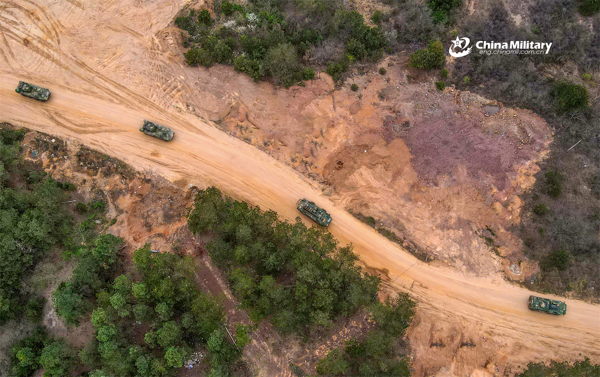 Armored vehicles attached to a combined-arms brigade under the Chinese PLA 72nd Group Army maneuver towards the designated area during a day-and-night training exercise in early March, 2025. (eng.chinamil.com.cn/Zhang Mao)