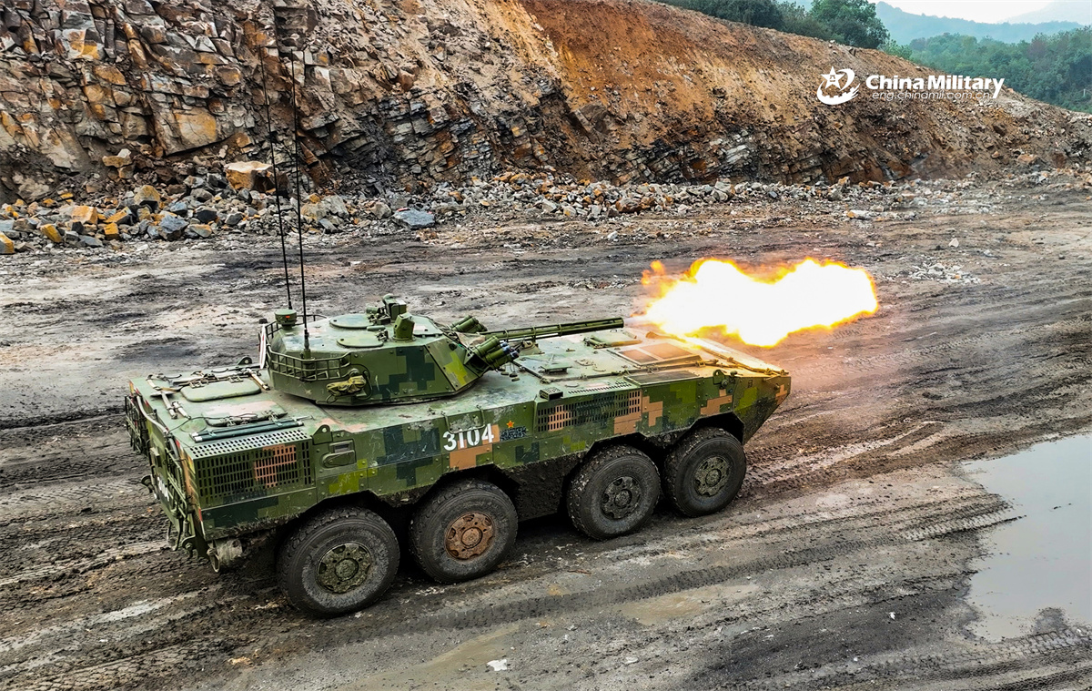 A wheeled assault vehicle attached to a combined-arms brigade under the Chinese PLA 72nd Group Army fires at the mock target during a day-and-night training exercise in early March, 2025.(eng.chinamil.com.cn/Zhang Mao)