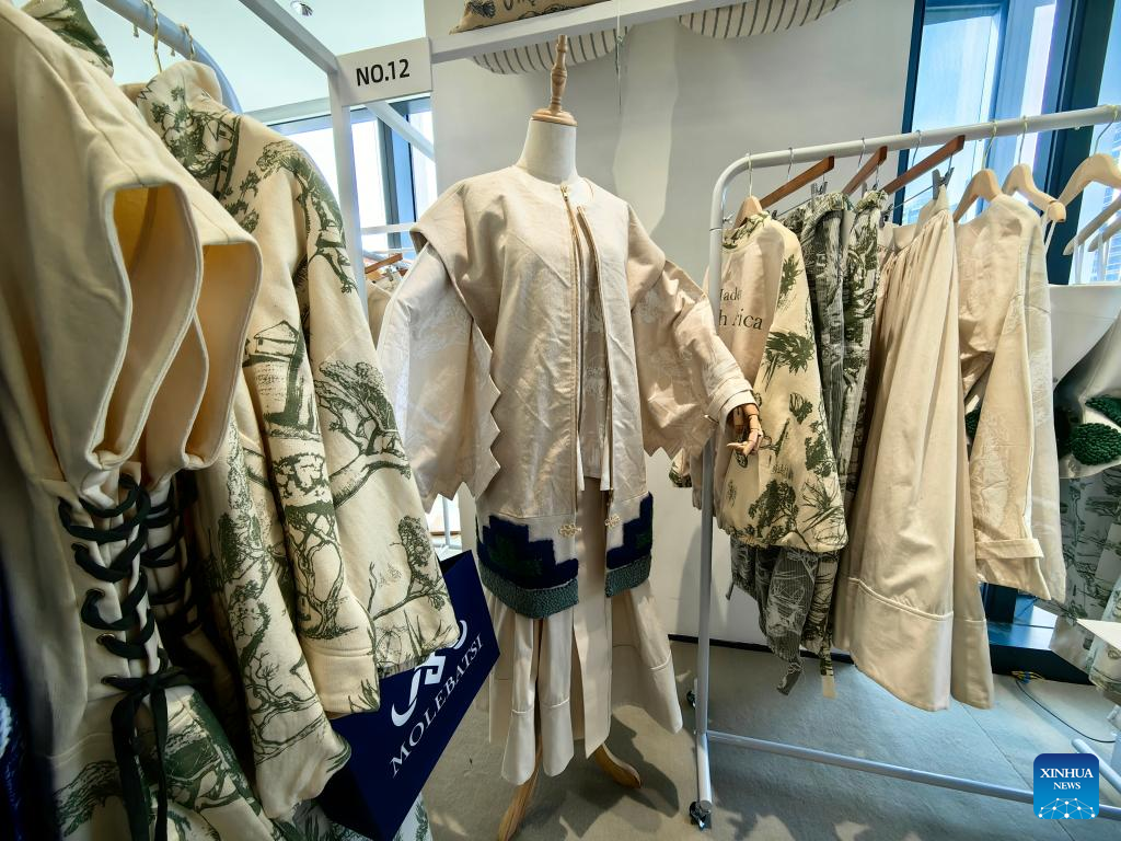 Collections of South African fashion brand Molebatsi are displayed at the trade exhibition MODE during Shanghai Fashion Week in east China's Shanghai, March 25, 2025. (Xinhua/Zhou Rui)
