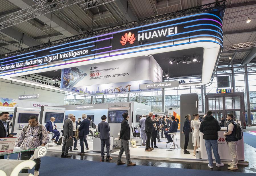 People visit the exhibition booth of Huawei at Hannover Messe 2025 in Hannover, Germany, on April 1, 2025. (Xinhua/Zhang Fan)