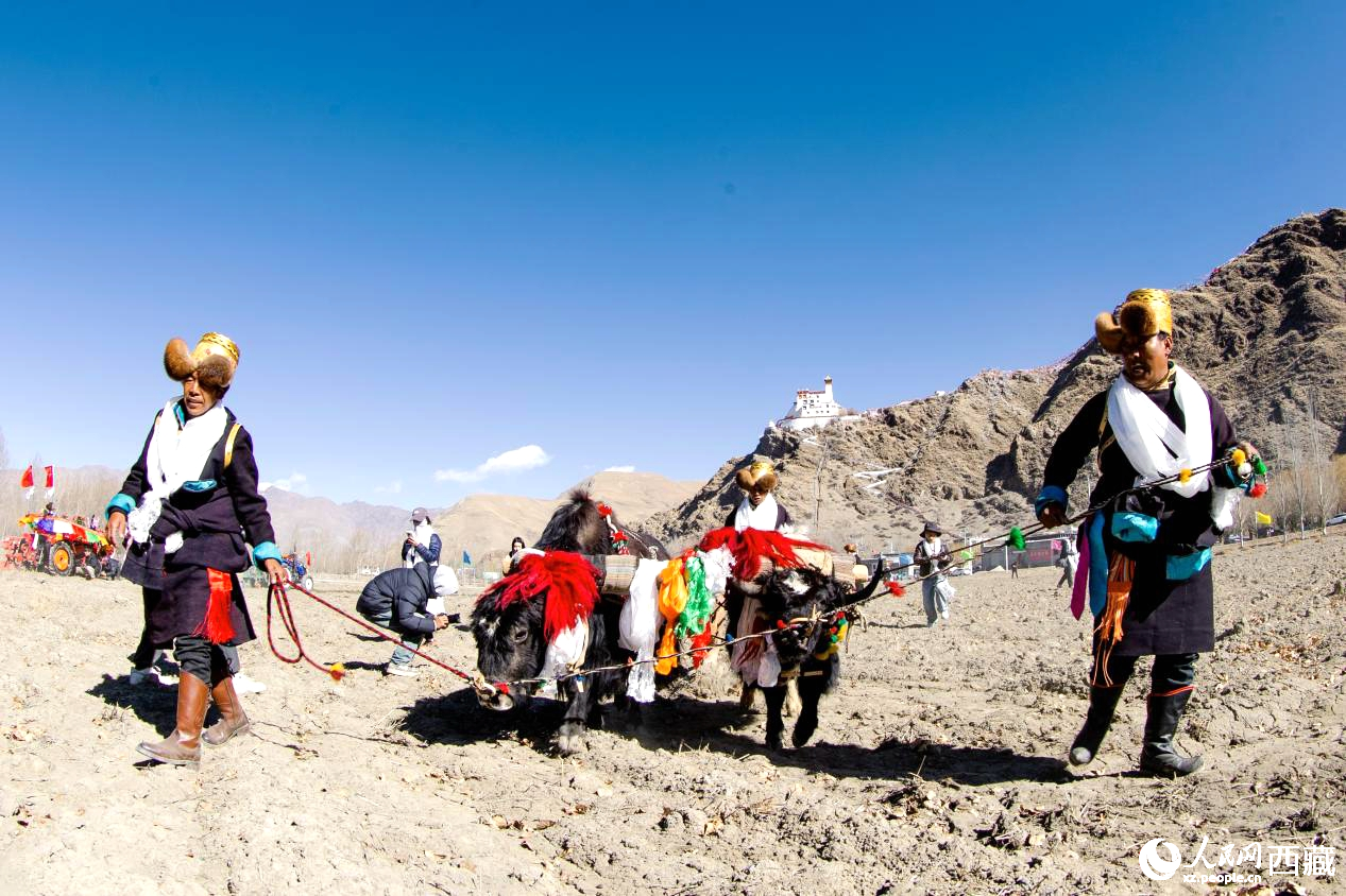 Farmers engage in a spring plowing ceremony in Nedong district, Shannan city, southwest China's Xizang Autonomous Region. (Photo/People's Daily Online)
