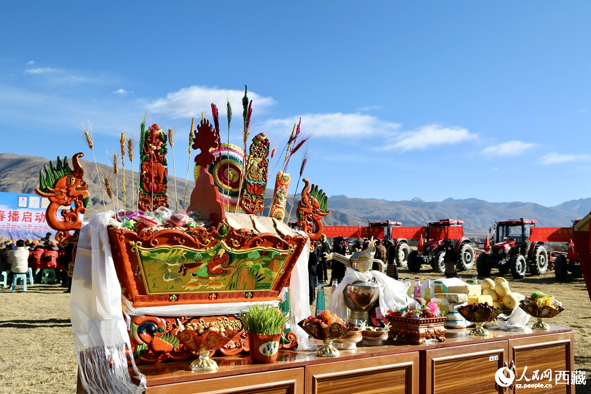 A Chemar, a container of roasted highland barley flour symbolizing abundant harvests, is displayed during a spring plowing ceremony in southwest China's Xizang Autonomous Region. (Photo/People's Daily Online)