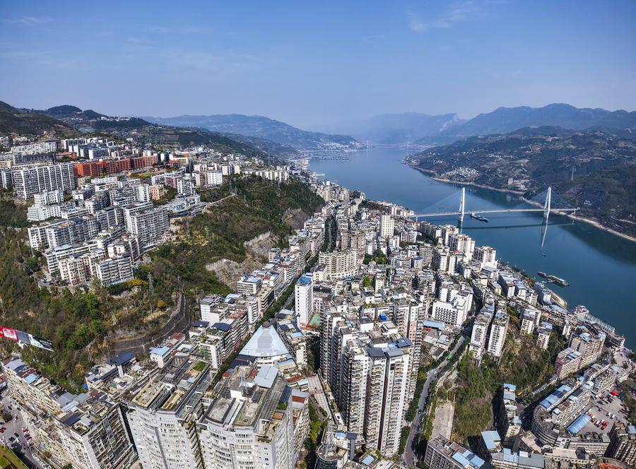 An aerial drone photo shows an urban view of Fengjie County, southwest China's Chongqing Municipality, Feb. 12, 2025. (Photo by Zhu Song/Xinhua)