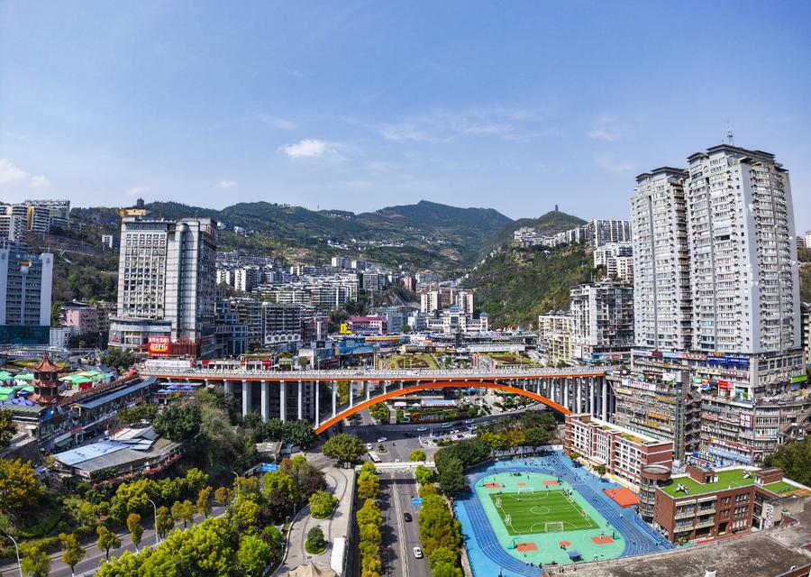 An aerial drone photo shows people walking on an overpass in Fengjie County, southwest China's Chongqing Municipality, Feb. 12, 2025. (Photo by Zhu Song/Xinhua)