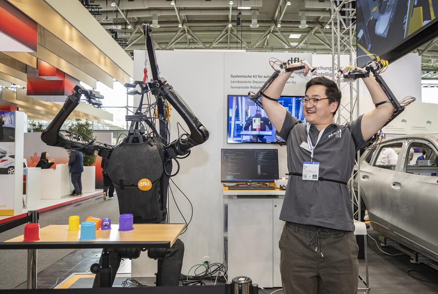 An exhibitor controls a robot at Hannover Messe 2025 in Hannover, Germany, on March 31, 2025. (Xinhua/Zhang Fan)