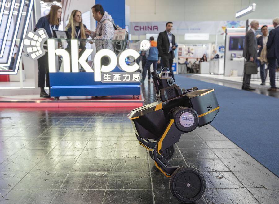 This photo taken on April 1, 2025 shows a robot at the exhibition booth of Hkpc at Hannover Messe 2025 in Hannover, Germany. (Xinhua/Zhang Fan)