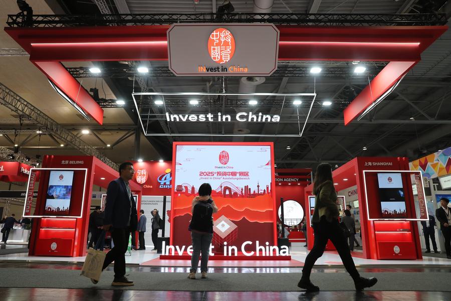 This photo taken on March 31, 2025 shows the exhibition booth of "Invest in China" at Hannover Messe 2025 in Hannover, Germany. (Xinhua/Du Zheyu)