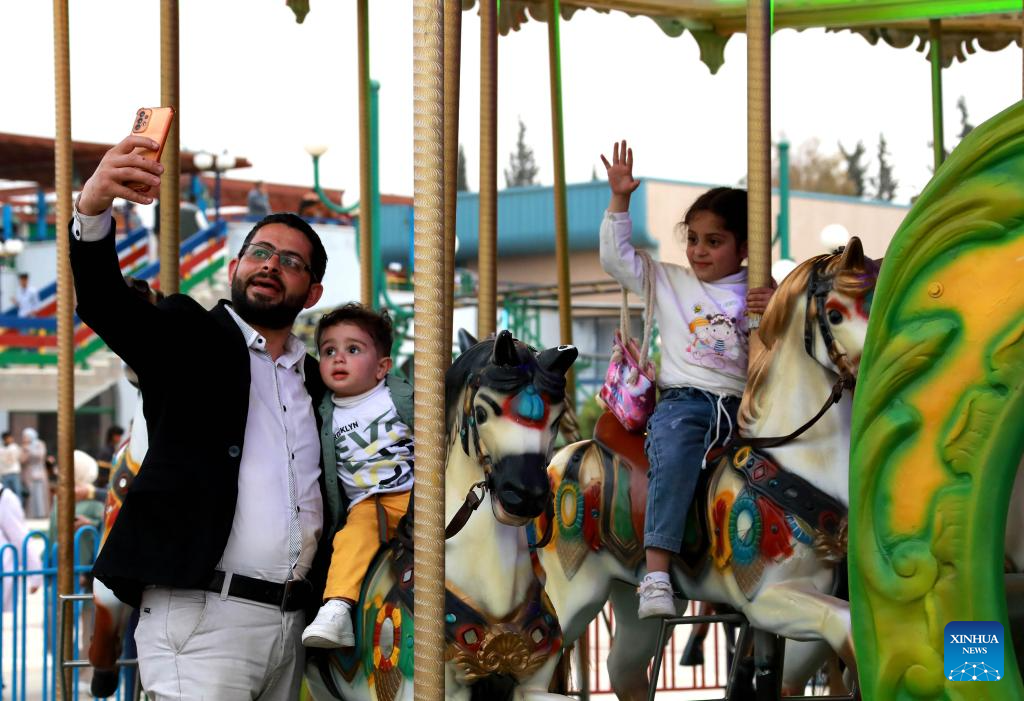 People have fun at an amusement park on the third day of the Eid Al-Fitr holiday in Damascus, Syria, April 2, 2025. (Photo by Ammar Safarjalani/Xinhua)