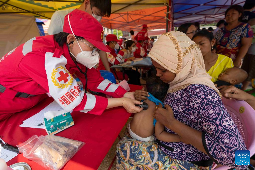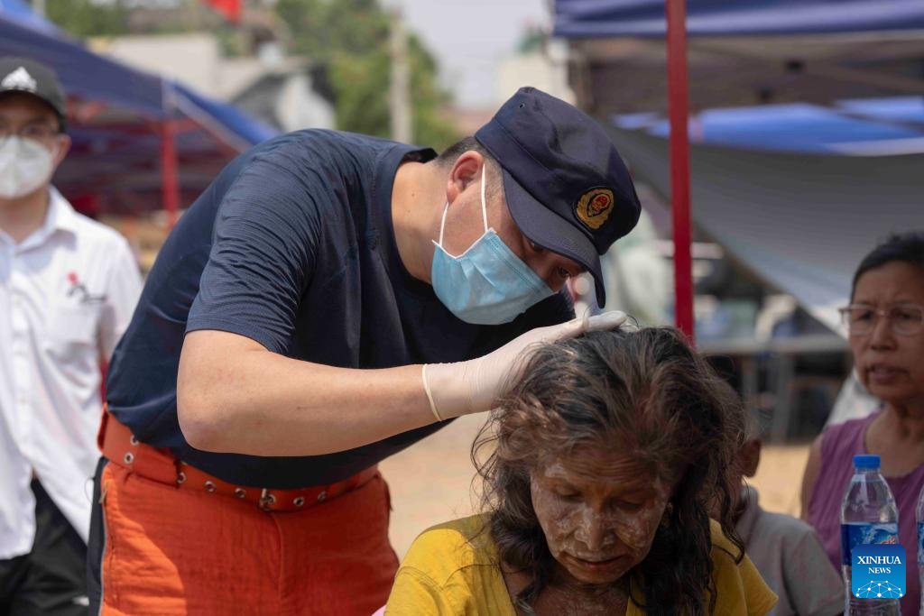 A Chinese rescuer provides medical consultations at a shelter in Mandalay, Myanmar, April 3, 2025. Chinese rescuers provide medical consultations for quake-affected people at a shelter in Mandalay on Thursday. (Xinhua/Cai Yang)