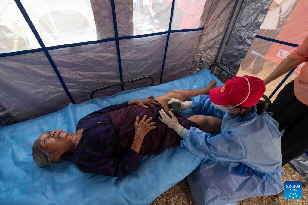 A Chinese rescuer checks the condition of a woman at a shelter in Mandalay, Myanmar, April 3, 2025. Chinese rescuers provide medical consultations for quake-affected people at a shelter in Mandalay on Thursday. (Xinhua/Cai Yang)
