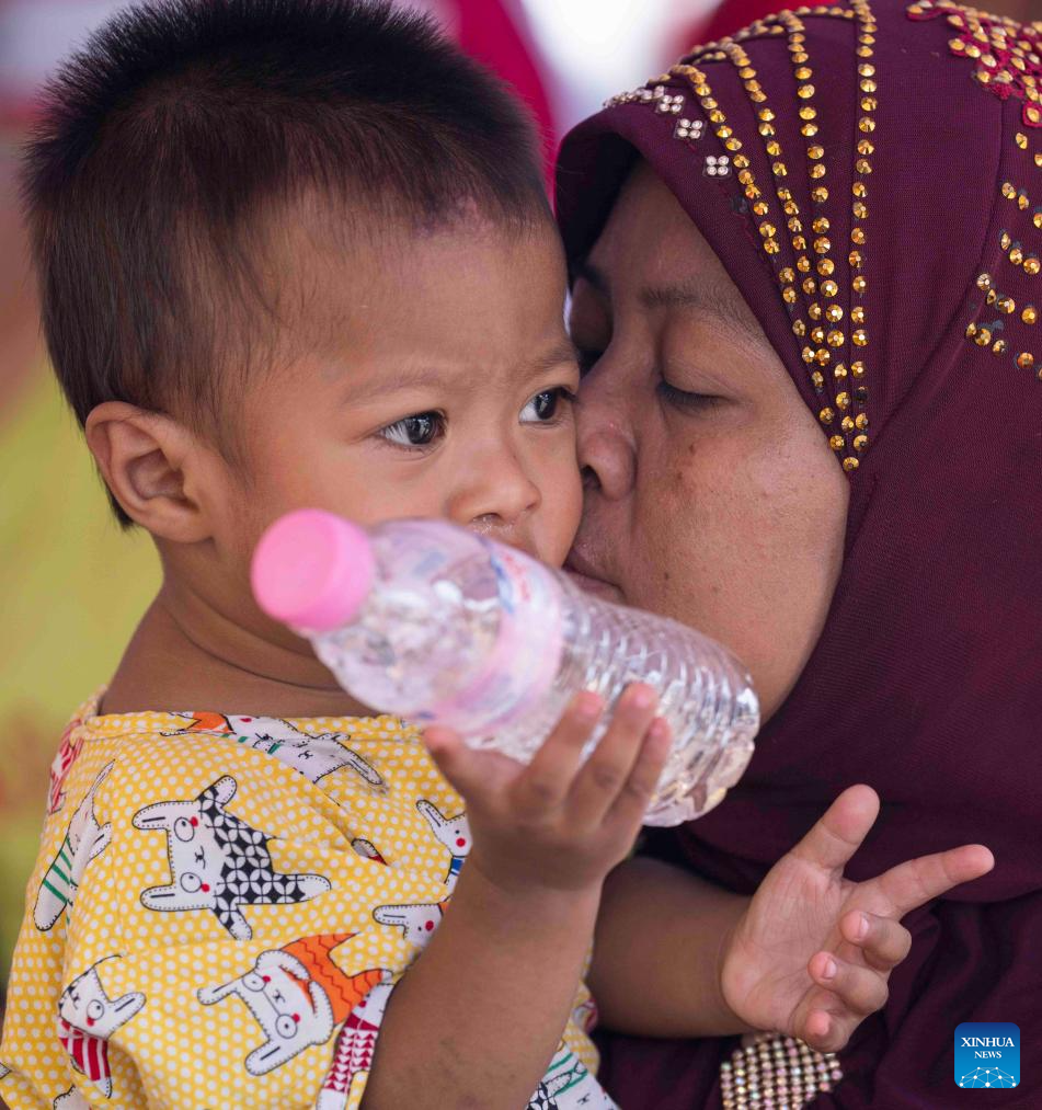 A woman brings her child for medical consultation at a shelter in Mandalay, Myanmar, April 3, 2025. Chinese rescuers provide medical consultations for quake-affected people at a shelter in Mandalay on Thursday. (Xinhua/Cai Yang)