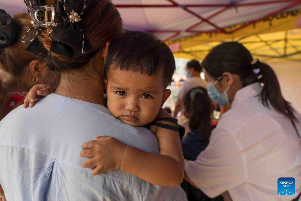 A Chinese rescuer checks the condition of a child at a shelter in Mandalay, Myanmar, April 3, 2025. Chinese rescuers provide medical consultations for quake-affected people at a shelter in Mandalay on Thursday. (Xinhua/Cai Yang)